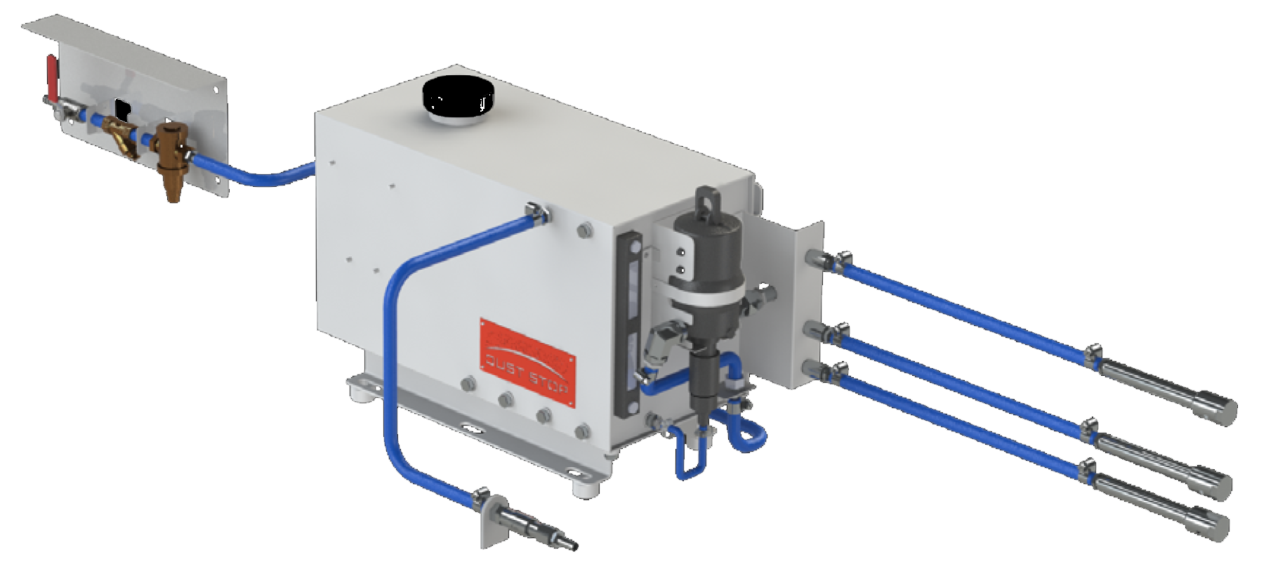 The Dust Stop system uses an airless dosing pump system top feed water through a custom designed airless foaming nozzle that draws a foaming agent into the water supply.